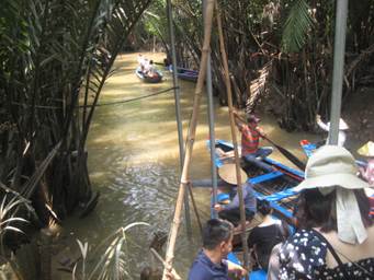 案内の画像では、西表島、奄美大島等のマングローブ林のような場所を想像しておりましたが、実際は中州の中の小川を広げ、その中を何十艘もの小舟が往来しております。