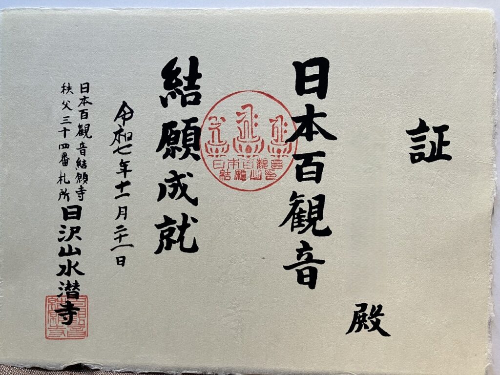 令和5年(一昨年)秋より坂東33を始め、昨年秋結願し、その後西国33を始め今年7月に結願しました。今回秩父34を巡り、日本百観音を結願しました。
